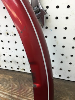 I gave the frame a good cleaning and then started the polishing by hand with actually a pretty course grit. It took quit a while but I worked through all of the grits. The red paint polished beautifully, it has a deep shine but it is a hand rubbed shine that has some originality to it. I wasn't totally happy with the paint chips, the rust was pretty thick in those areas. A lot of the rust cleaned and polished away, I will hit those areas with a clear to help them from getting worse. Overall I a happy with the results of the frame. The red is a great color, it has a ruby like look to it that is very cool!
