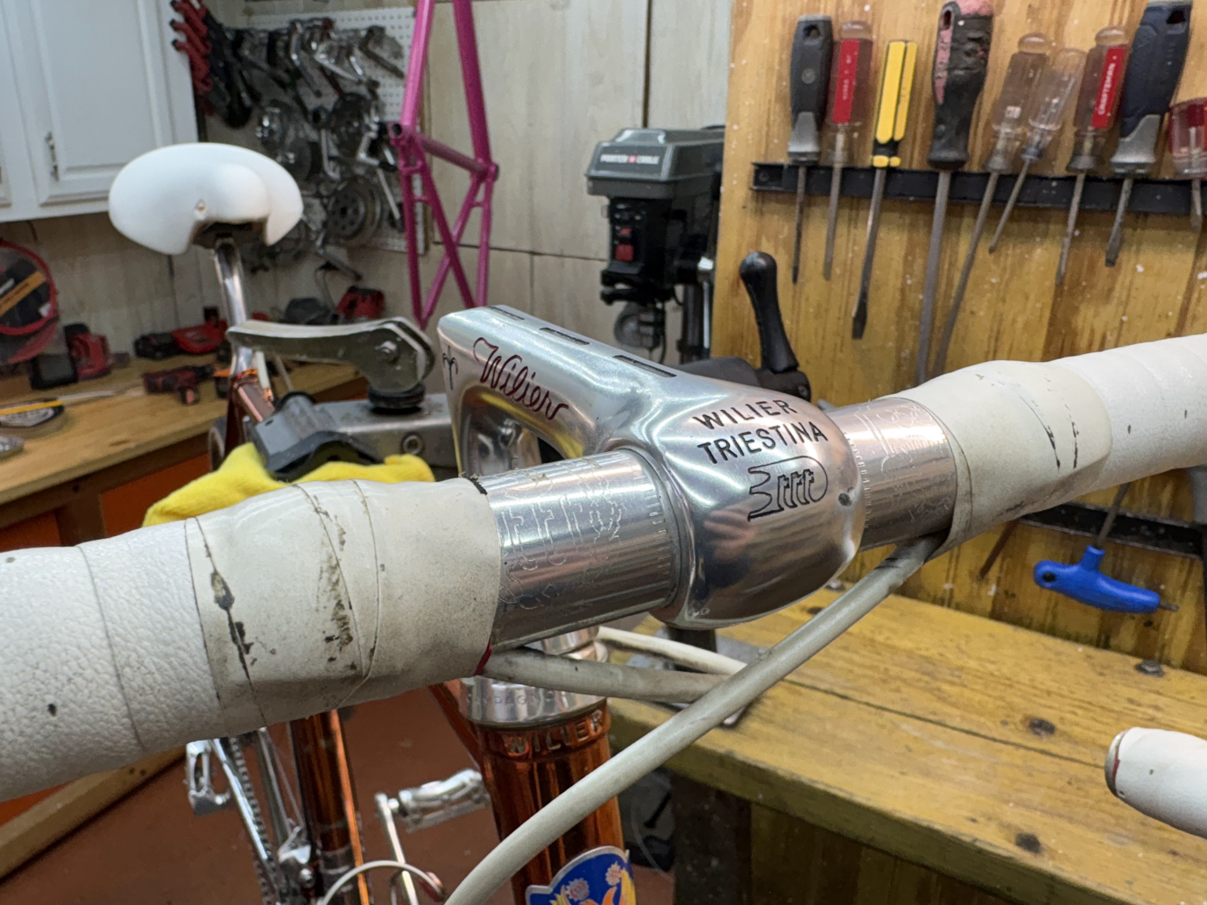 The paint is some what rough, the cables are frozen, the wheels are out of true but I htink the Varsity will come back a long way. The Varsisty will receive new bearings, cables, cable housings, tire tubes and tires. Hoefully everything will polish niceley.